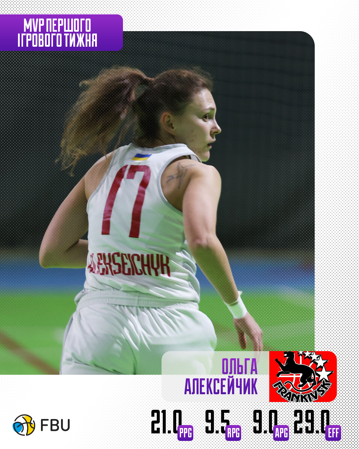Анастасія Шепелюк (Франківськ-Прикарпаття) — 21.0 очка, 3.5 підбирання, 4.5 передачі. РЕ 23.0