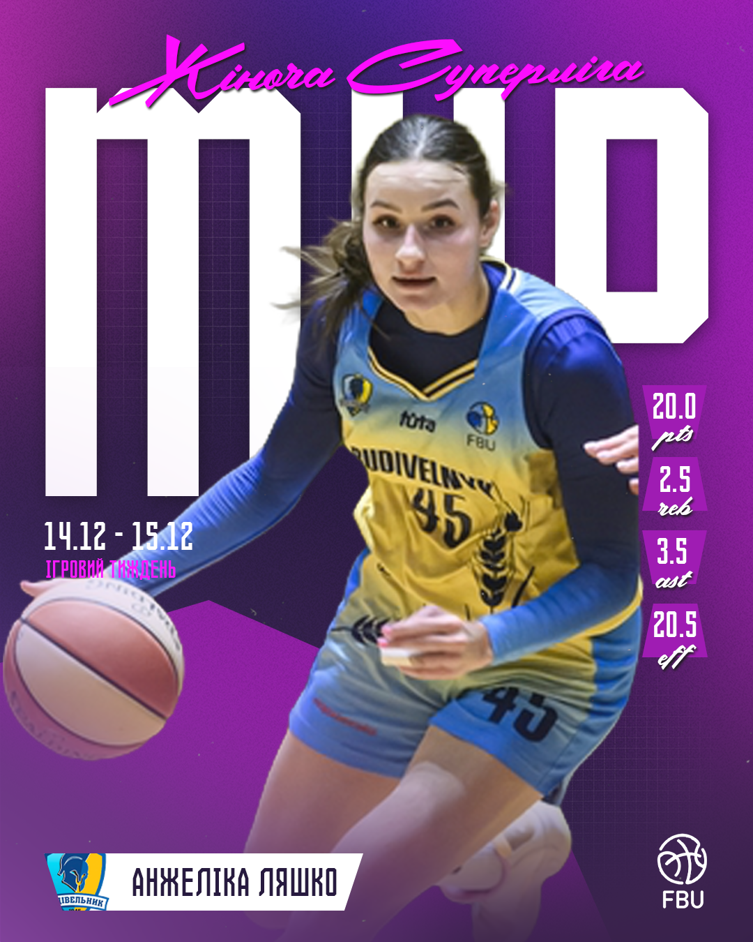 MVP ігрового тижня стала Анжеліка Ляшко. Вона була кращою в першому матчі проти Франківська-Прикарпаття, набравши 25 очок, а у другій грі до 15 очок додала 5 передач.