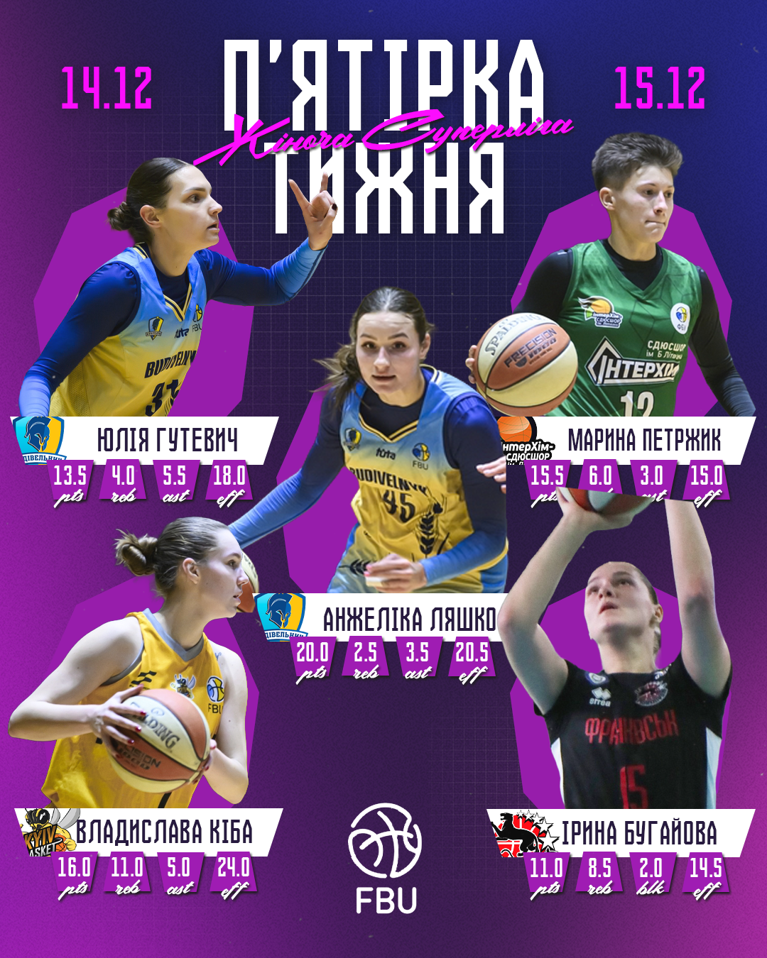 Владислава Кіба (Київ-Баскет) — 16.0 очка, 11.0 підбирання, 5.0 передачі. РЕ 24.0